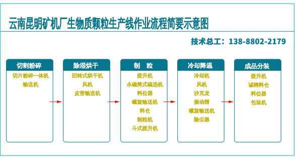 雖然使用的原料多種多樣,但是萬變不離其宗,以生物質(zhì)造粒機為核心設(shè)備的一整套生產(chǎn)線基本生產(chǎn)流程可以大致分為:切割粉碎、除濕烘干、造粒、冷卻、成品分裝等幾個環(huán)節(jié)。下面就是成套生物質(zhì)顆粒生產(chǎn)線的工藝流程示意圖: